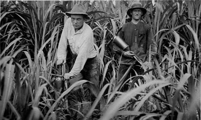 Sokeriruokofarmille töihin haluavan siirtolaisen saavuttua Australiaan hän teki farmarin kanssa sopimuksen työstä. Työnvälitystoimistossa allekirjoitettiin sopimus, jossa lähes vannottiin työurakan suorittamista loppuun asti. Työ farmilla keskittyi sokeriruo’on hakkuuseen eli keininleikkaamiseen. ”Keini” tulee sanasta ”sugarcane” eli sokeriruoko. Kuva on Pohjois-Queenslandista Australiasta sokeriruokofarmilta, jossa F. Harju Kälviältä (seisoo) ja Toivo Kähkönen Reisjärveltä (nojaa) myrkyttävät tuholaisia keinipellolla.